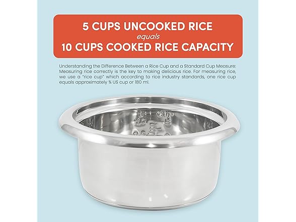 - LARGE CAPACITY cooks up to 10 cups of cooked rice for the entire family and more! This rice cooker holds up to 5 cups of raw rice and 10 cups of cooked rice - enough for multiple servings.