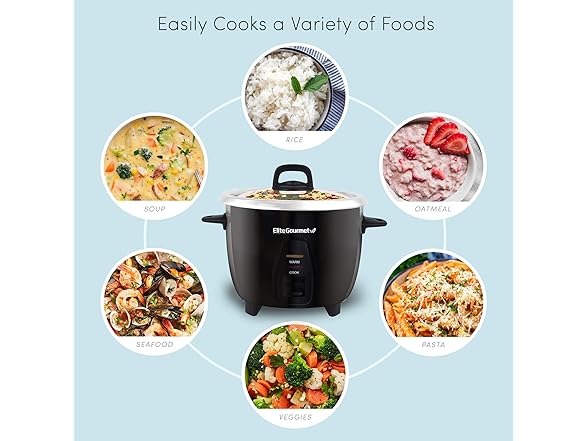 Here’s how you can cook fluffy & delicious rice like a professional chef effortlessly! do you like rice but cooking it seems like a boring and time-consuming process? do you want to make sure that your basmati rice is evenly cooked and always ready to serve? now you don't have to waste your time standing over a boiling pot anymore thanks to the most innovative and time-saving rice cooker! representing the Elite Gourmet ERC2001BX ultimate Professional rice cooker! you don't have to be a master chef in order to impress your loved ones with the fluffiest, most delicious and perfectly cooked rice anymore! this time-saving and easy-to-use rice cooker is going to become your little secret! why choose the Elite Gourmet rice cooker? save time by cooking up to 10 Cups of rice – cooking large quantities of rice can be tricky but you don't have to worry anymore! our practical rice cooker can cook up to 10 Cups (5 Cups uncooked) of rice, enough for the whole family! stainless steel inner pot will make your life easier – the removable surgical-grade 304 stainless steel pot will make sure that your rice is evenly cooked and cleaning it is as simple as 1, 2, 3! keep your rice warm & fresh for hours – the handy “keep warm” function will allow you to prepare your Jasmine or Brown rice in advance and serve it once the rest of the meal is ready! perfect for all types of rice – whether you like perfectly cooked Jasmine rice, Brown rice, Black rice, basmati rice or Sushi rice, the ERC2001BX rice cooker will get the job done! and not just for rice – you can use our premium rice cooker to steam vegetables, meat, beans or quinoa and cook delicious meals effortlessly! don’t hesitate! click “add to cart now & enjoy your favorite rice dishes like never before!