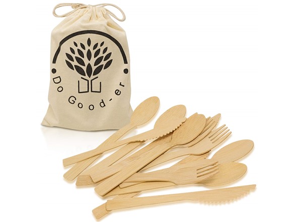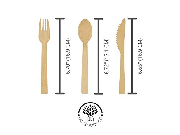 - STURDY & DURABLE - Bamboo is stronger than its Birch Wood competitors. There's no funny "woody" taste or splinters with Do Good-er Cutlery to ruin your dining experience! Our forks can stab and pick up most food, including steak! The tines are standard length, not a "spork", for easier use. The knife has amazing sharp, serated edges for effortless slicing, and the spoons are deep enough to get a proper mouthful of soup or yogurt. Thoughtfully designed for you!