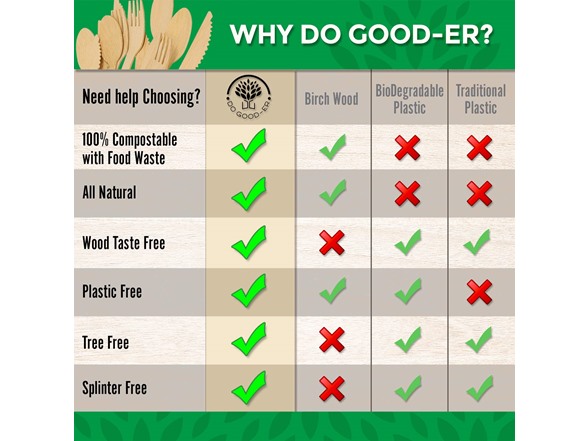 - FASTER REGROWTH - Did you know that Birch wood takes 20 years to regrow and Bamboo only 3-5 years? Our suppliers harvest the bamboo thoughtfully with a dedicated vision of ensuring the most environmentally method of cutting and replanting. The fast growth of the Bamboo plant was clearly the best option when creating a disposable product such as the Do Good-er Compostable Cutlery Sets. Be a Do Good-er with us!