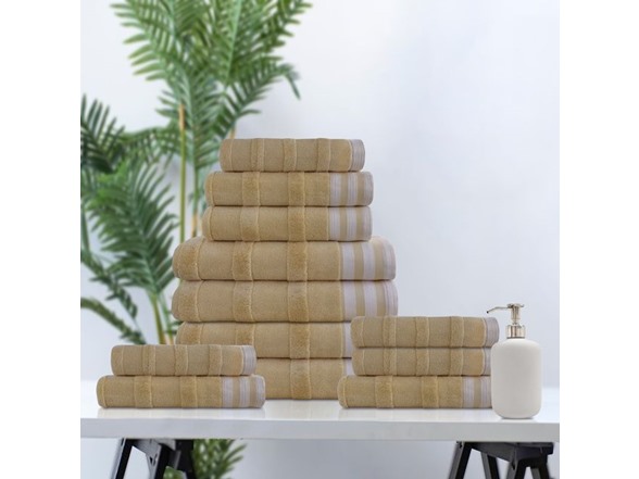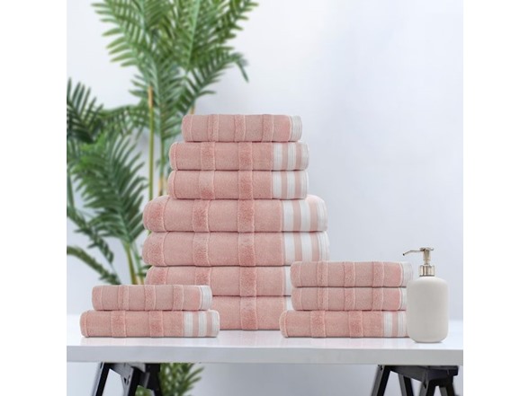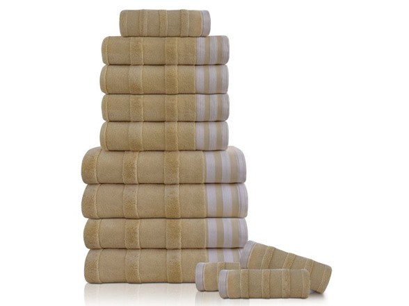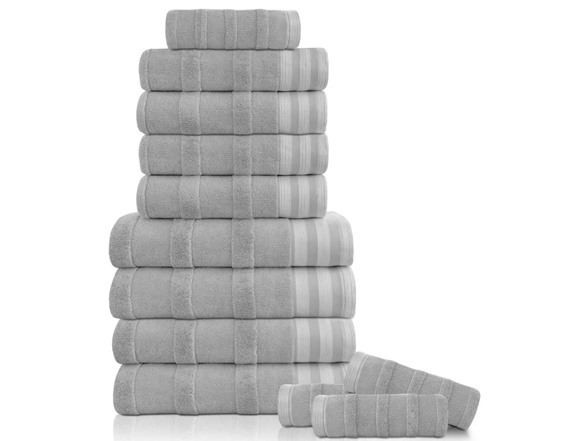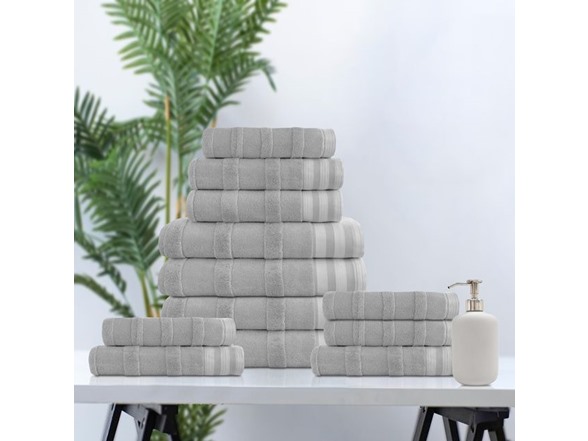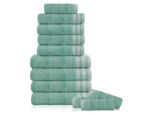 Premium cotton towels with soft, plush texture Stylish jacquard stripe design complements modern or classic décor. Fast-absorbing and quick-drying performance Machine-washable and built for long-lasting use Upgrade your towel collection with the Kathy Ireland 12-Piece Stripe Jacquard Kyoto Towel Set. Designed for both luxury and practicality, this elegant towel set features a timeless stripe jacquard weave and ultra-soft cotton material. Highly absorbent and fast-drying, it’s perfect for busy households and spa-like comfort. With enough pieces for the whole family or your guest suite, this set includes 4 bath towels, 4 hand towels, and 4 washcloths—making it a complete bathroom refresh in one purchase.