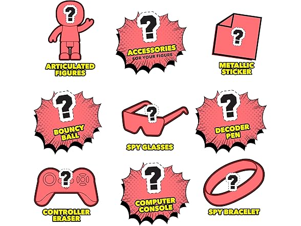 - Surprises include three spy figures, two figure accessories, a UV spy pen, a controller eraser, a bouncy ball, a spy chair, a spy computer console, a super gamer bracelet, glasses, and a metallic sticker.