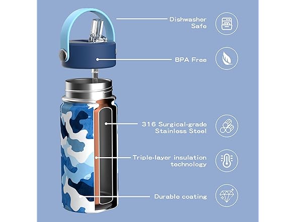 - 316 Surgical-Grade Stainless Steel: Safety is the priority when choosing products for our kids. We use the best-in-class materials for every part of our products. Our bottles are made with 316 Surgical-Grade stainless steel inside - a metal premium than 18/8 stainless steel in rust-free and purity. Our straw caps are BPA Free and Toxin-free so that every sip of water is healthy and fresh for our kids.