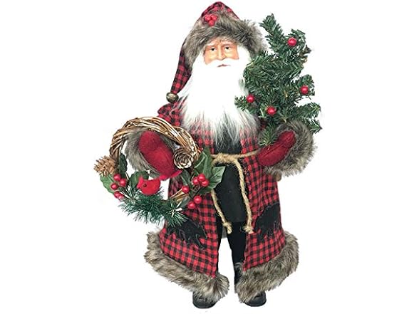 Santa has been on a long winter walk collecting some of Mother Nature's homemade holiday decorations: a little green fir tree and an exquisite wreath decorated with berries and pine cones. To keep out the cold, Santa wears one of his favorite faux fur trimmed plaid jackets with black bear silhouette patches and a matching hat. Experience the natural wonder of the Christmas holiday with this elegantly handcrafted 15" Plaid Black Bear Claus figurine.