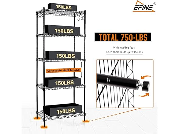 - STRONG WEIGHT CAPACITY: Each shelf holds up to 150-lbs, with the total max weight being a sturdy 750-lbs. You also have the option to purchase an extra wire shelf if you’re looking for even more space.