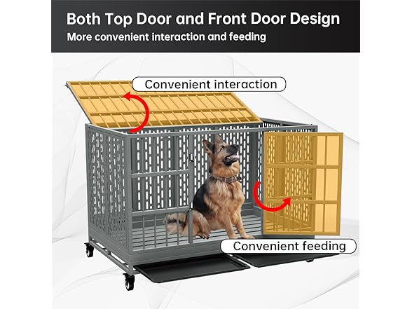 - Upgraded Door Lock Design:The front door of the steel dog kennel is convenient for pets to get in and out, the top door can be opened to allow you to interact with and feed your pets. Two Upgraded door locks on the front and top securely lock the door in place.