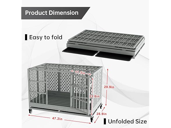 - Folding Design for 5 Minutes to Install: The extra strong big dog crate has a foldable design, so you don't have to spend time assembling. The slide-out tray that comes with the kennel can catch fallen any soiling, helping you clean out the cage quickly and easily.