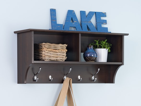Ideal for an ever expanding household, the 60" Wide Hanging Entryway Shelf will keep your entryway belongings together in one place! Suitable for any front hallway, foyer or mudroom, the four compartments provide ample storage for everyone in your family. Fill with baskets, gloves, mittens, hats and books. Five large and four small hooks provide plenty of places to hang jackets, coats, hoodies, sweaters, bags and purses. Installs easily with our innovative hanging rail system.