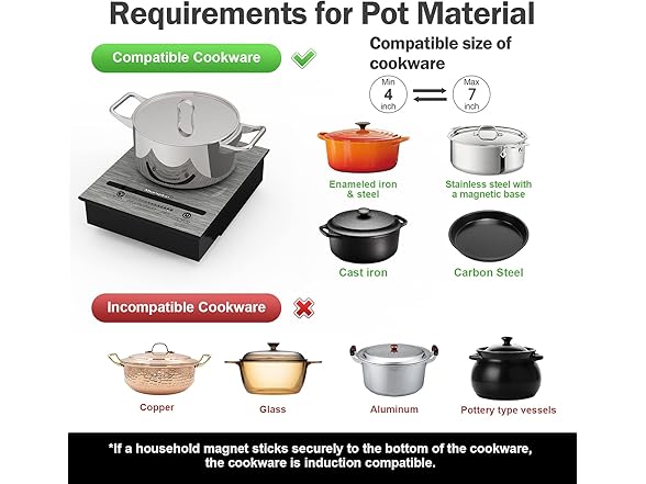 - 【Warning】The maximum power of this small induction cooker is 500W, so it is intended only for small-portion cooking. It is compatible with iron or stainless steel cookware with a bottom diameter of 3.9 to 6.5 inches.