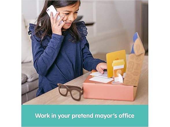 - TRANSFORMING PLAYSET: Includes a box that transforms into the desk at a bustling mayor's office, that kids can use to be a pretend play grown up with a laptop, mobile phone, glasses and coffee cup