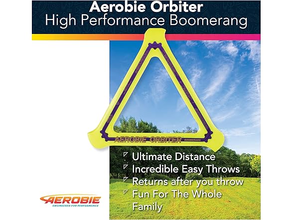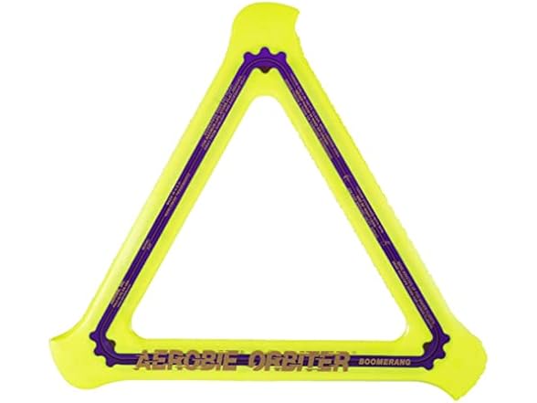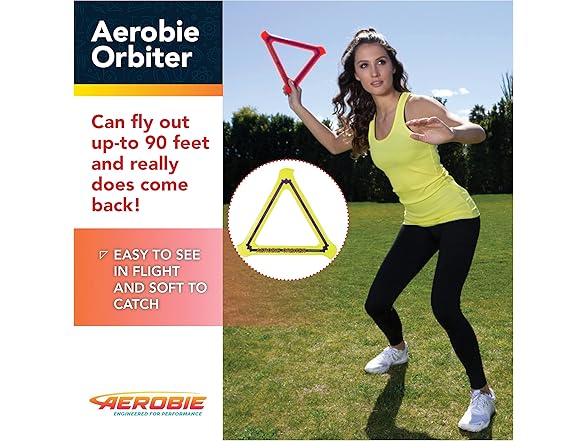- AEROBIE ORBITER: This high performance boomerang flies out about 90 feet and really does come back; The triangular design and brightly colored soft rubber edge make it easy to see in flight and soft to catch