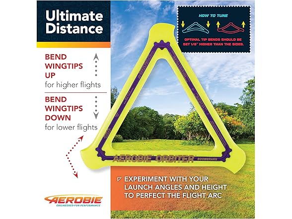 - ULTIMATE DISTANCE: Gently bend the boomerang's soft rubber wingtips up for higher flights and bend the wingtips down for lower flights; Experiment with your launch angles and height to perfect the flight arc