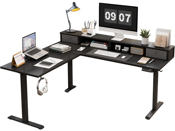 - 【Electric Height Adjustment】 Agilestic standing desk adjusts from 27.8"–45.9" with a smooth, quiet motor (<55 dB) and 2 memory presets. 【Spacious L-Shaped Design】 The large L-shaped desktop fits corners and offers ample workspace. 【Durable & Stable】 Industrial-grade steel frame supports up to 176 lbs. Reliable motor tested 50,000+ times. 【2 Storage Drawers】 Includes 2 fabric drawers to keep essentials organized. Tabletop is low-VOC and air-safe. 【Everyday Convenience】 Includes dual hooks, wire holes, and anti-collision rebound for safe daily use.