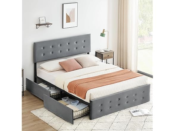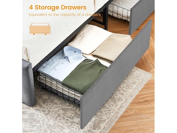 - 【AMPLE STORAGE SPACE】Say goodbye to the hassle of digging through your room looking for items. Our queen bed frame features four large storage drawers with smooth wheels, allowing you to easily access and organize linens, clothes and other essentials.
