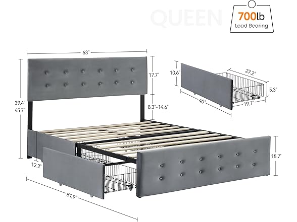 - 【FUNCTIONAL AND STYLISH】Our queen bed frame not only provides a practical storage solution, but also adds a touch of style to your bedroom. Enjoy the convenience of having everything you need at your fingertips while enhancing the aesthetics of your space.