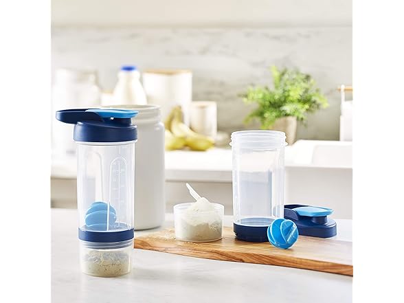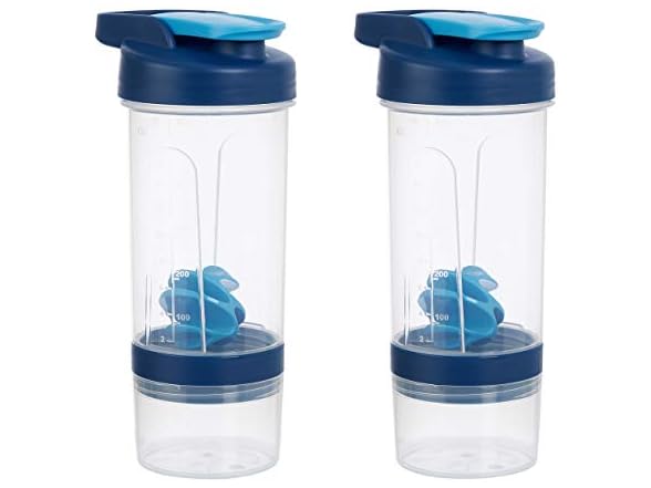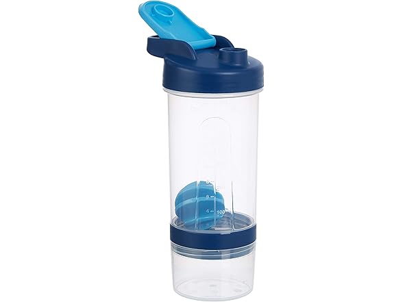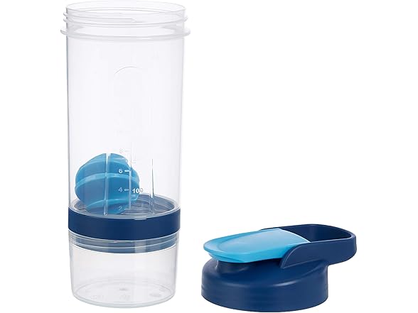 Ideal for gym enthusiasts and outdoor adventurers, the shaker bottle pack is suitable for powering up during workouts, sports, or even while heading to work or school. Each shaker bottle features a spill-proof screw-on lid that allows secure, leak-free use, even when mixing and shaking. The mixer ball whisk inside the protein shakers helps thoroughly combine and dissolve your protein shake ingredients with ease. Designed with two spiral compartments, this protein shaker bottle with powder storage allows you to conveniently store dry items such as protein powders and supplements to meet all your needs. Constructed from durable, BPA-free PP, these shaker bottles also boast a transparent body with a stylish blue lid and accents, keeping you both secure and stylish while using your blender cups for protein shakes. The protein cups shaker is not only functional but also easy to clean, as it is top-rack dishwasher-safe. Measuring 4.7 by 3.5 by 9.1 inches, this shaker bottle is compact and backed by an Amazon Basics 1-year limited warranty for reliable performance as you mix your protein shake bottles at home or on the go.