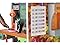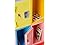 - A vibrant, multicolored wall structure with 360-degree play options. It includes a desk with two drawers on one side, five lockers and four cubbies on the opposite side, and a water bottle refill station on the side of the structure