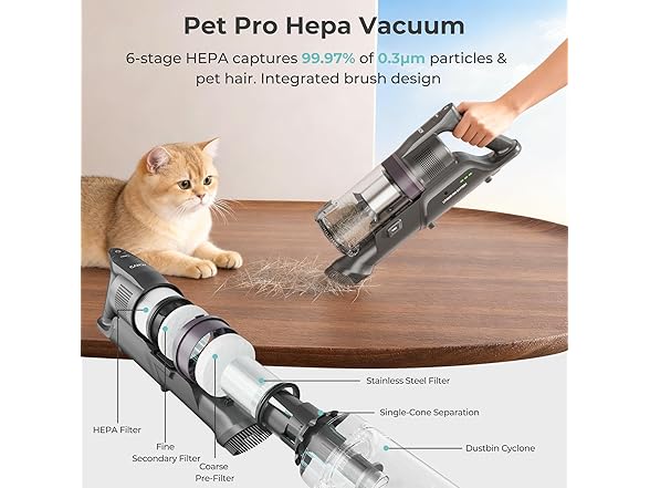 - Hands Free Emptying & HEPA Filtration: This cordless upright vacuum has One-touch dust release system. Directly empties into trash bins without getting your hands dirty. This hardwood floor vacuum features 0.7 liter dust capacity.Candy pet hair vacuum captures 99.97% of 0.3 micron particles. And it features a fully detachable and washable cyclone system.