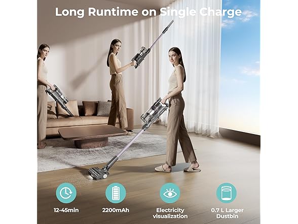 - Powerful Suction & 45 Minute Runtime: This Cordless Vacuum Cleaner features a powerful brushless motor with 45 minutes of runtime per charge.Efficiently cleans homes over 1000 square feet and offers two specialized suction modes for different surfaces and cleaning requirements.Such as pet Hair,carpets,floors and sofa which is a good vacuum cleaners for home.