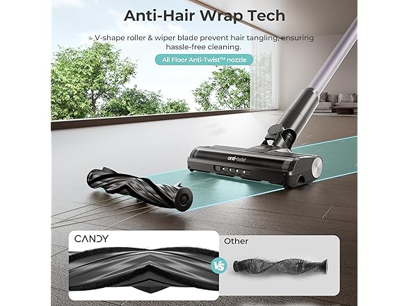 - Tangle-Free Pet Hair Dominator & White Vision: This cordless vacuum has innovative V-shaped anti-tangle brush roll system.As a home essentials It can actively prevents pet hair wrapping.Candy Vacuum built in white LED searchlight which can reveals hidden dust and pet hair.For those who need cleaning pet hair, cat food, dog food, and cat litter, it is a very useful vacuum.It can also serve as a handheld vacuum cordless to provide you with more detailed assistance.