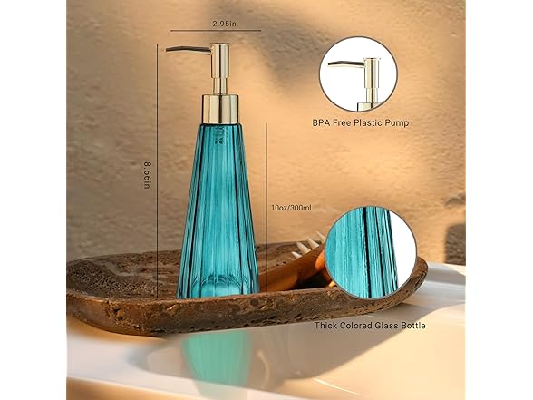 - 【Premium Glass Soap Dispenser with 10oz Capacity】 Crafted from high-quality, thickened glass, this durable and shatter-resistant soap dispenser is a safe, BPA-free choice for both soap and hand sanitizer. With a practical 10oz (300ml) capacity, it perfectly meets daily family needs while reducing refill frequency. Its compact design fits neatly on any bathroom vanity or kitchen countertop, serving as a stylish and space-saving countertop organizer.