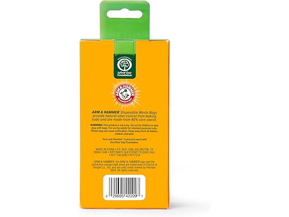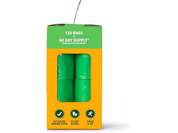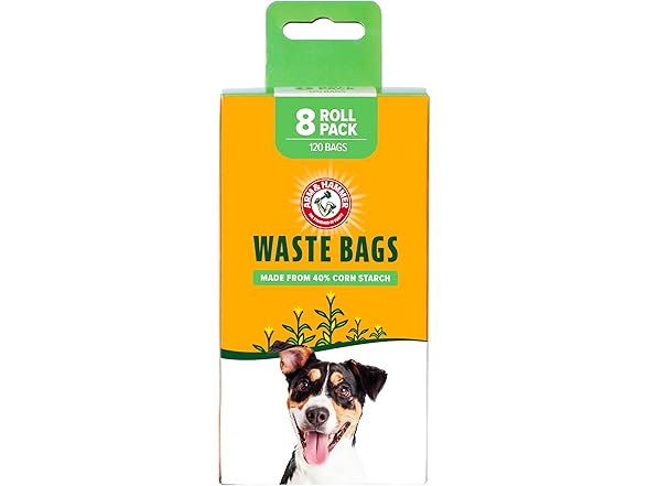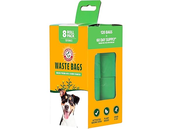 Arm & Hammer Dog Poop Leakproof Plant Based 120 Count Waste Bags, Unscented, Made From 40% Corn Starch With Activated Baking Soda, Pack of 8 rolls, Green