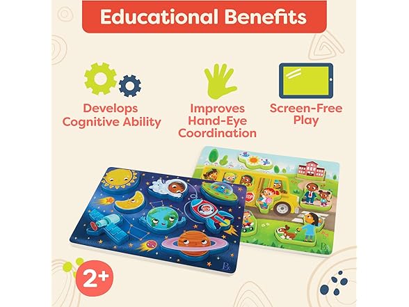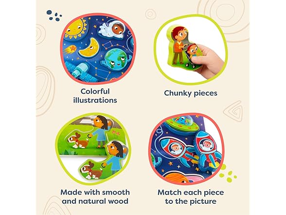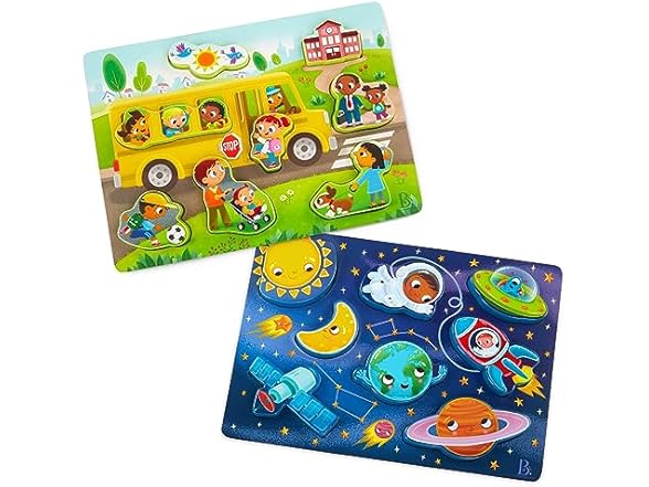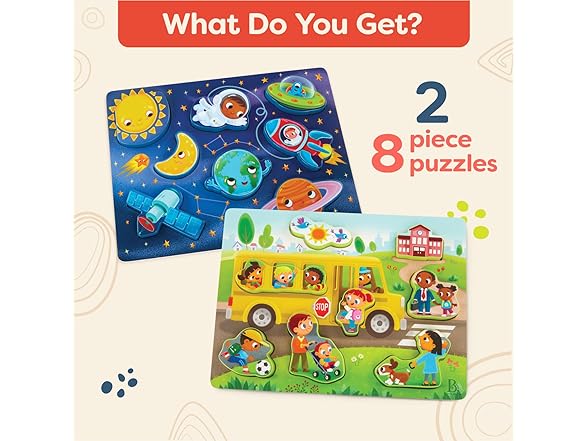B. toys – Peek & Explore 2 – Pack – Outer Space & School Bus – Chunky Puzzle Pack – Puzzles for Toddlers, Kids – 8 Pieces Each – 2+ Years