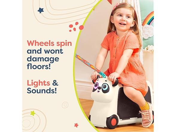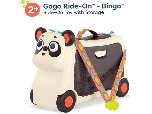 Bring your lil' treasures anywhere you go with the Bingo Gogo Ride-On from Land of B.! Whether you’re jetting off on a trip or sleeping over at a friend’s house, this ride-on toy can easily double as a little suitcase. Measuring 18.8” (L) x 7.7” (W) x 13.6” (H), the Gogo Ride-On has enough storage space to hold your child’s precious belongings and includes handy interior elastic straps that help those belongings stay put. This panda ride-on is also equipped with a detachable strap and a little leaf handle, making it easy for your child to pull along. Not to mention that the leaf doubles as the key that locks it up! Designed with fun in mind, this ride-on is inspired by the Land of B. character Bingo who comes alive with multicolored, luminous eyes and sound effects! 3 AAA batteries are required and included. Recommended for children 2 years and over.