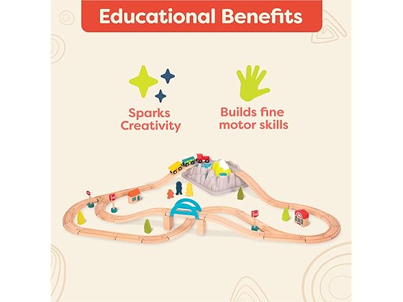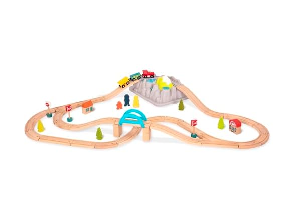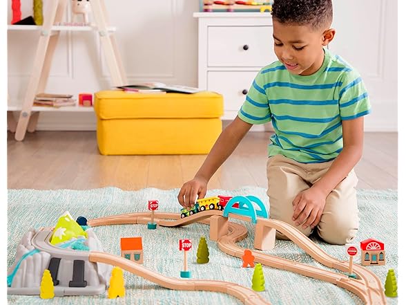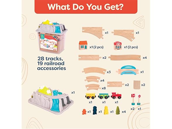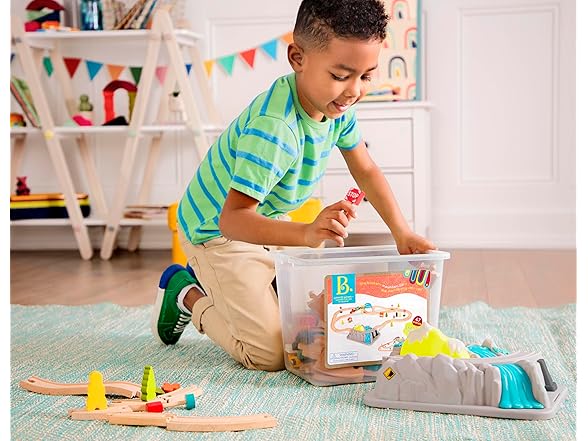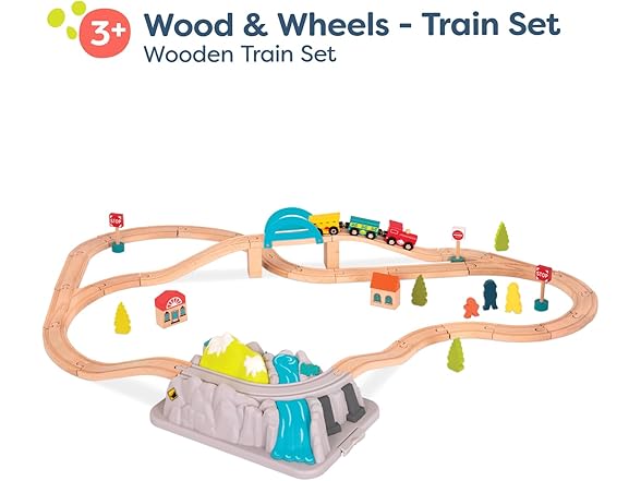 B. toys – Wood & Wheels Train Set– 47 Pieces – Tracks & Accessories – Storage Bucket with Mountain Lid – Classic Toys for Toddlers, Kids – 3+ Years