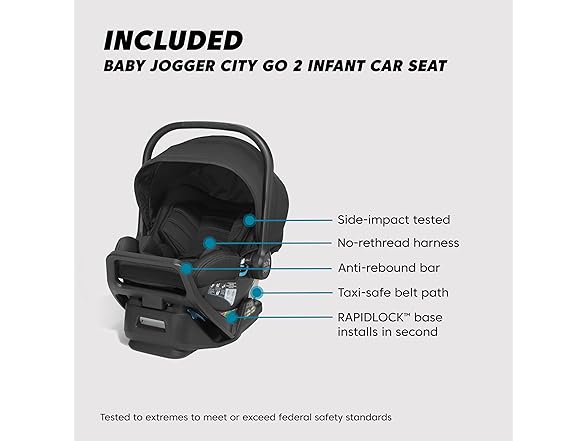 - City GO 2 infant car seat is tested to extremes to meet or exceed federal safety standards and comes with a RAPIDLOCK base and anti-rebound bar for a safe and secure installation in seconds