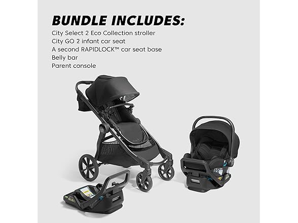 - Includes City Select 2 Stroller, City GO 2 Infant Car Seat with adapters, a second RAPIDLOCK base, belly bar, and parent console
