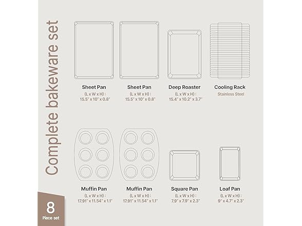 - COMPLETE SET FOR EVERY BAKING NEED: The set includes a stainless steel cooling rack, sheet pans, muffin pan, loaf pan, square cake pan, and a deep roaster with a handle, providing a comprehensive solution for your baking endeavors.