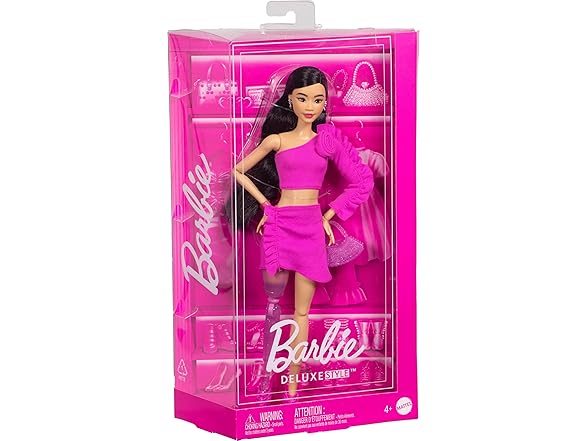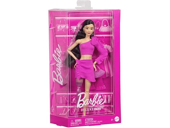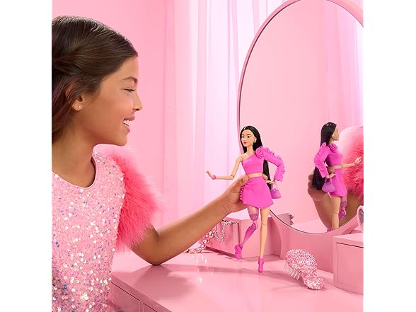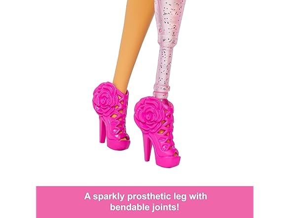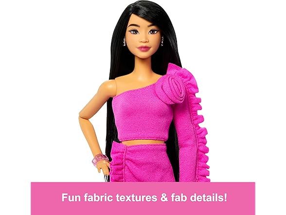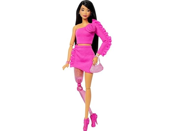 Barbie Deluxe Style Doll #2 in Barbiecore Outfit, Black Hair and Glittery Prosthetic Leg, Pink Top and Skirt Set with Rosette Detail and Accessories