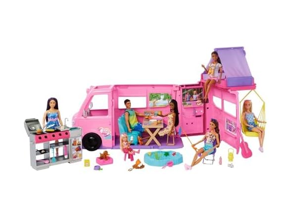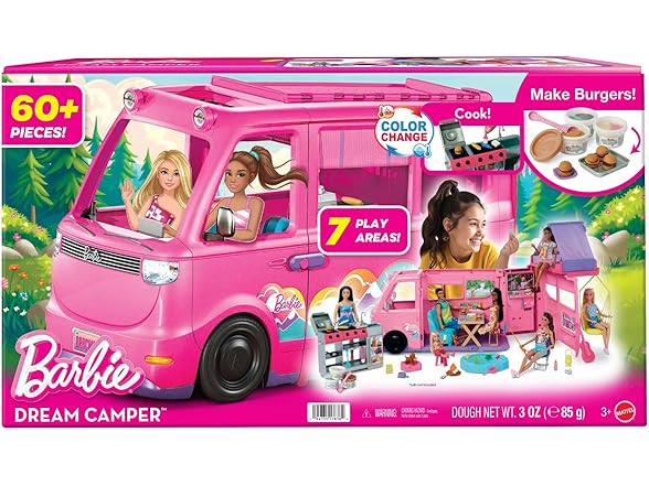 - Head to the great outdoors with the Barbie Dream Camper playset, featuring 7 play areas and 60+ accessories, including a puppy, to inspire endless camping stories!