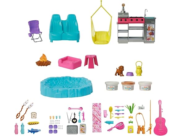 - Kids can set up camp with the fishing pond, swing chair, picnic table, barbeque station, and more -- don't forget the pet bed!