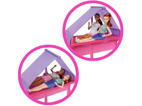 - Open up the camper to reveal plenty of space for Barbie dolls (sold separately) to sleep and play, including a collapsible tent with room for 2 on the roof, a living room, dining area, and bathroom!
