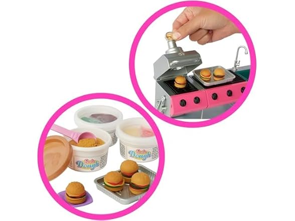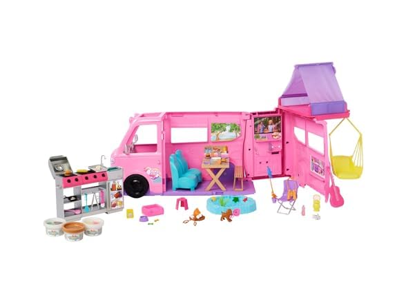 Adventure awaits with the Barbie Dream Camper playset, featuring seven play areas and more than 60 accessories to play out adventures in the great outdoors! Give the camper a push to drive into playtime, then unfold it to reveal a pop-up roof tent, living room, dining area, and bathroom. There's so much fun to be had -go fishing in the pond, relax in the swing chair, and set up space for the adorable pet puppy. When it's time for dinner, use the included dough to whip up burgers for Barbie doll and friends (sold separately) or grill up fun on the barbeque -watch the food transform as it "cooks" with color-change action! With so many storytelling opportunities, the Barbie Dream Camper playset is a gift packed with fun for kids 3 years old and up, especially those who love the outdoors! Dolls not included. Colors and decorations may vary.
