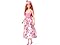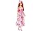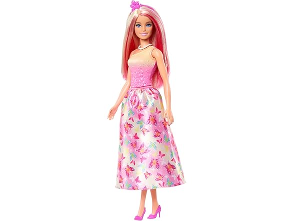 - Barbie doll has two-tone pink and blonde hair and wears a beautifully detailed ombre bodice with a matching butterfly print skirt.