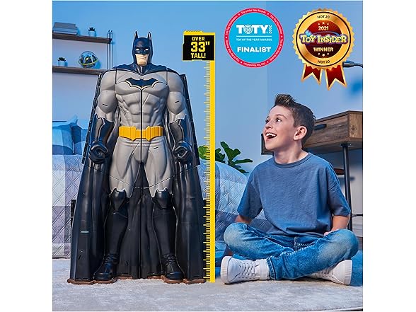- LIFE-SIZE BATMAN: Batman is over 33 inches tall! Includes exclusive 4” Batman action figure to add to your Batman collection! Gear up with 9 exclusive Batman accessories, including grappling hook, armor, and more!