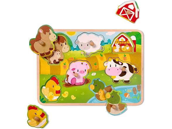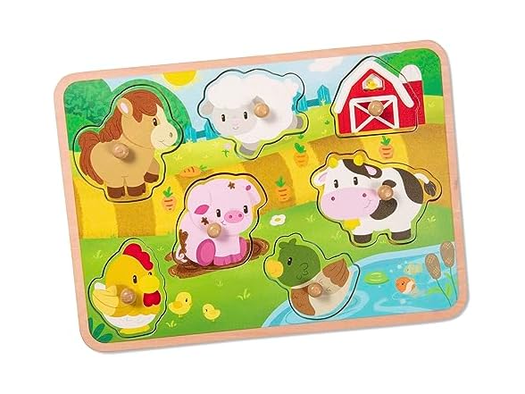 - On The Farm: Barnyard-inspired wooden peg puzzle with a quality finish and colorful illustrations.