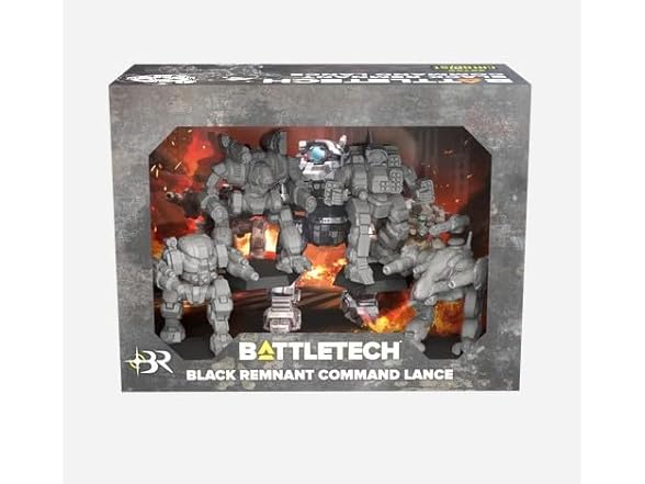 Unleash the Black Remnant Command Lance, straight out of Penny Arcade's streaming BattleTech campaign! Includes the Dragon Fire (with optional bits to create the DGR-3F and new DGR-9D variants), the Blood Asp I, Flashman, and Cyclops-no assembly required-along with four MechWarrior pilot cards and four Alpha Strike cards. Perfect for BattleTech and Alpha Strike action!