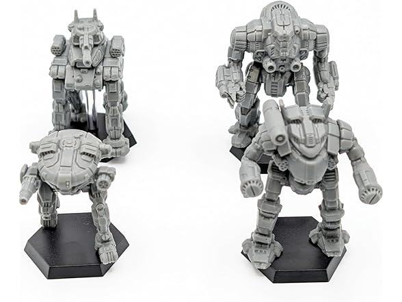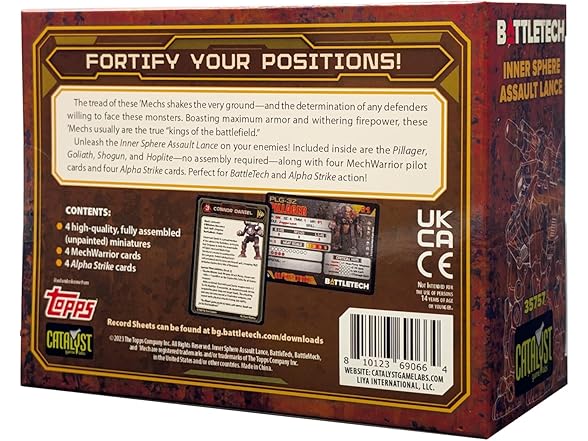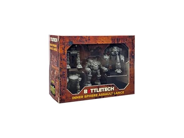 The tread of these 'Mechs shakes the very ground—and the determination of any defenders willing to face these monsters. Boasting maximum armor and withering firepower, these 'Mechs usually are the true "kings of the battlefield." Unleash the Inner Sphere Assault Lance on your enemies! Included inside are the Pillager, Goliath, Shogun and Hoplite—no assembly required—along with four MechWarrior pilot cards and for Alpha Strike cards. Perfect for Battletech and Alpha Strike action! — blurb from back of box