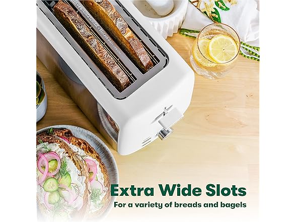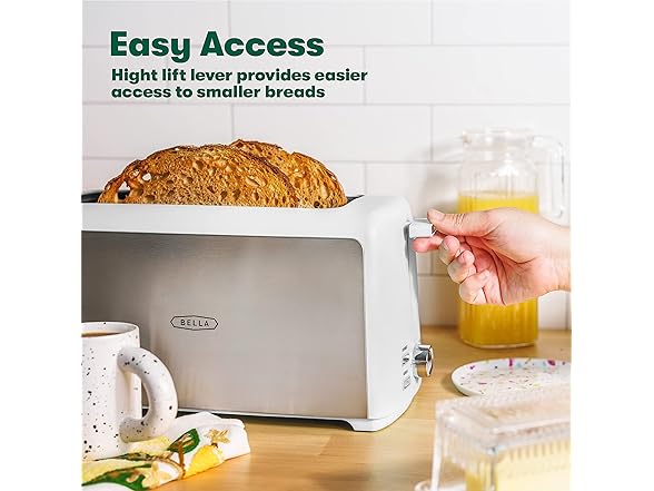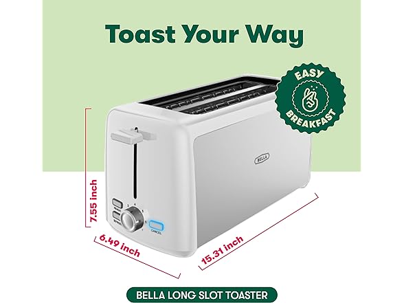 - FOR BREAD LOVERS - English muffins, Texas-style toast, bagels, sweet and savory dishes...you can make them all with this gorgeous bagel toaster by BELLA! The wide slots fit any type of bread to help you make all your favorite snack and breakfast recipes with ease