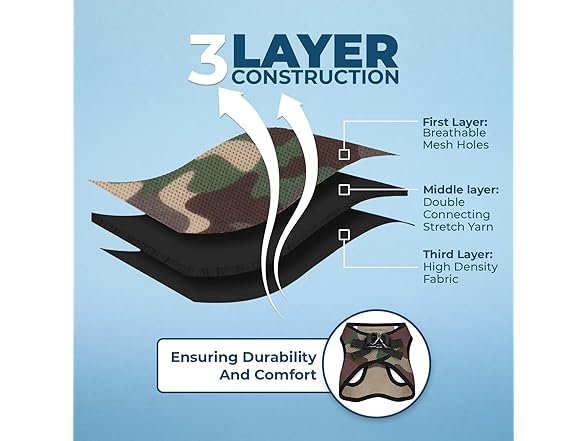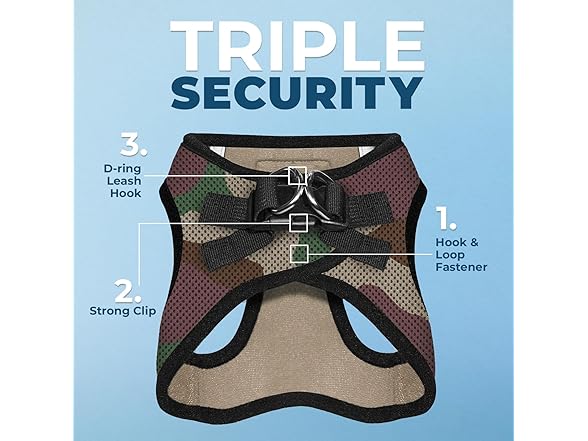 - Triple Security: Our harness provides three layers of protection with a secure hook and loop fastener, a sturdy buckle, and double D-rings, ensuring your pet's safety at all times