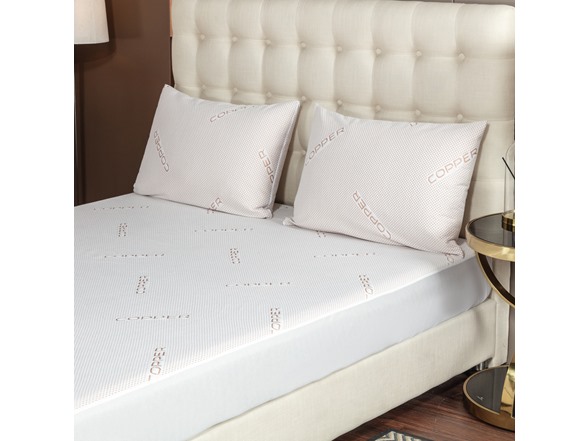 Boost your sleep hygiene regimen with the benefits of copper found in these Copper Infused Waterproof Pillow Protectors. Long known for its antimicrobial and antibacterial properties, copper fibers are woven into these plush protective standard pillow cases to help fight bacteria and odors, for lasting freshness and a better night's rest. This protector features a user-friendly zipper for easy insertion and secure fit of pillows. 95% polyester/5% copper/polyfill. Machine wash cold; tumble dry low.
