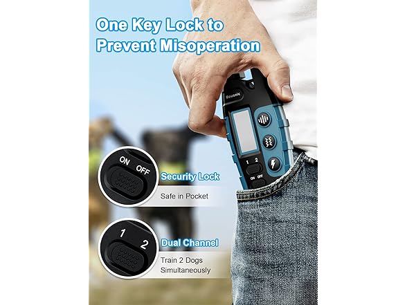 • Security Lock & Dual Channel: The e collar for dogs training is equipped with independent buttons on the ergonomic remote to operate separately, prevent misoperation and accidental shock, as well as switch Channel 1 or 2 clearly to train 2 dogs simultaneously.