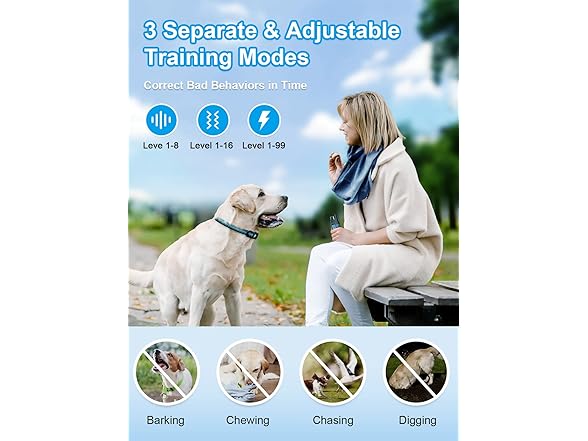 • 3 Separate & Adjustable Training Modes: Our shock collars offer 3 humane operation modes, Beep (1-8), Vibration (1-16), and Safe Shock (1-99), allowing you to train dogs in accordance with their aptitude by choosing the best appropriate mode level, correcting bad behaviors in time.