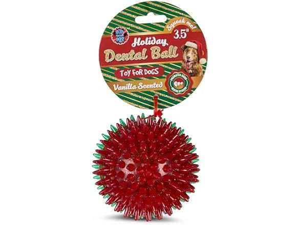 Bow Wow Pet Vanilla Scented Holiday Double-Sided Glitter Dental Ball Dog Chew Toy, 3.5-in