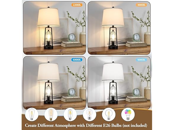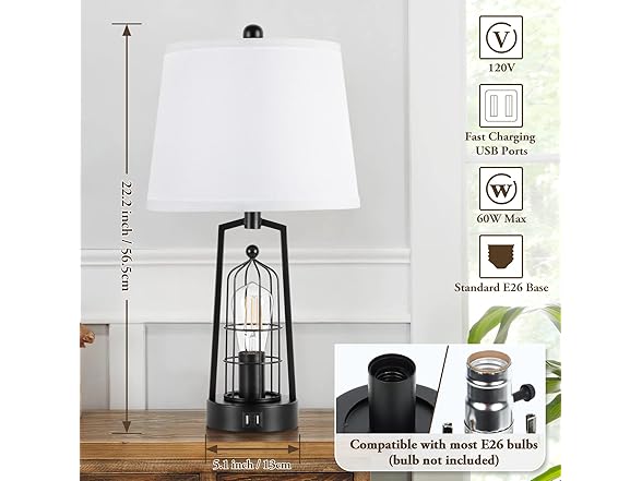 Brightever Farmhouse Table Lamps with 2 USB Ports, Set of 2 Rustic Industrial Desk Lamp for Living Room, 2-Light Black Bedside Lamp, Bedroom Nightstand Lamp with White Lampshade for House Decor, Reading