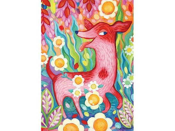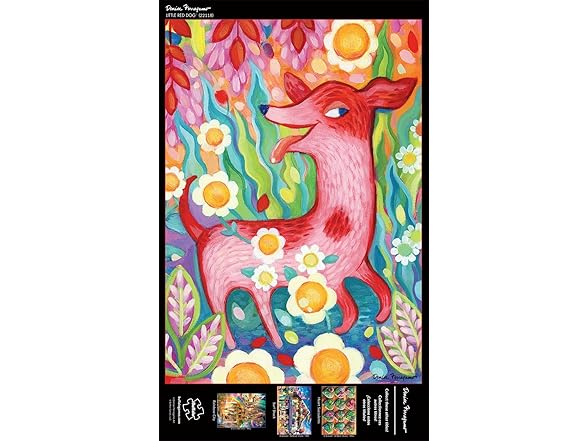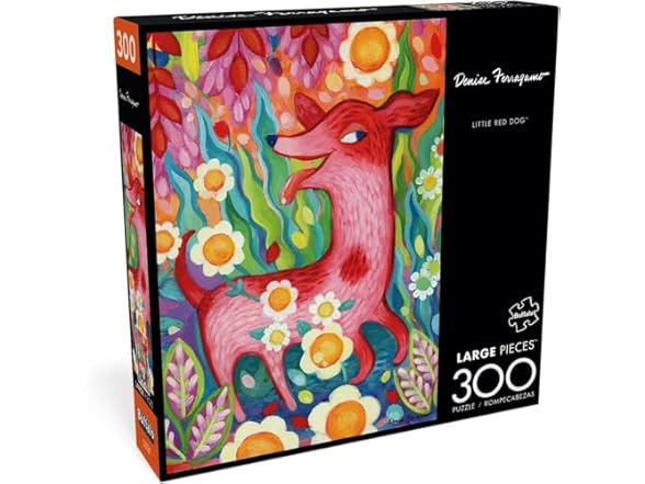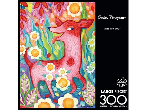 This 300-piece jigsaw puzzle by Buffalo Games is from the Vivid Collection and titled Little Red Dog. Enjoy piecing together this artwork from Denise Ferragamo of a silly red puppy with his tongue out, in a field of colorful flowers. The pieces of this puzzle are larger than traditional puzzle pieces, which makes them easier to see and hold for a pleasant puzzle experience. Every Buffalo Games jigsaw puzzle is manufactured from recycled puzzle board. A precision cutting technique guarantees that every piece will fit soundly with the company's signature Perfect Snap™. A bonus puzzle poster is also included so that you have a handy reference of what the completed puzzle should look like while you put yours together.
